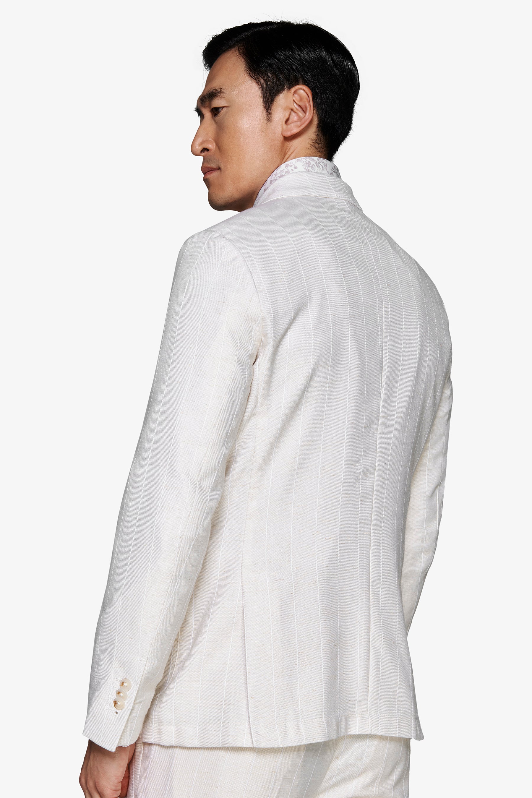 Americana cruzada a rayas. Corte entallado con solapas en punta y bolsillos aplicados.